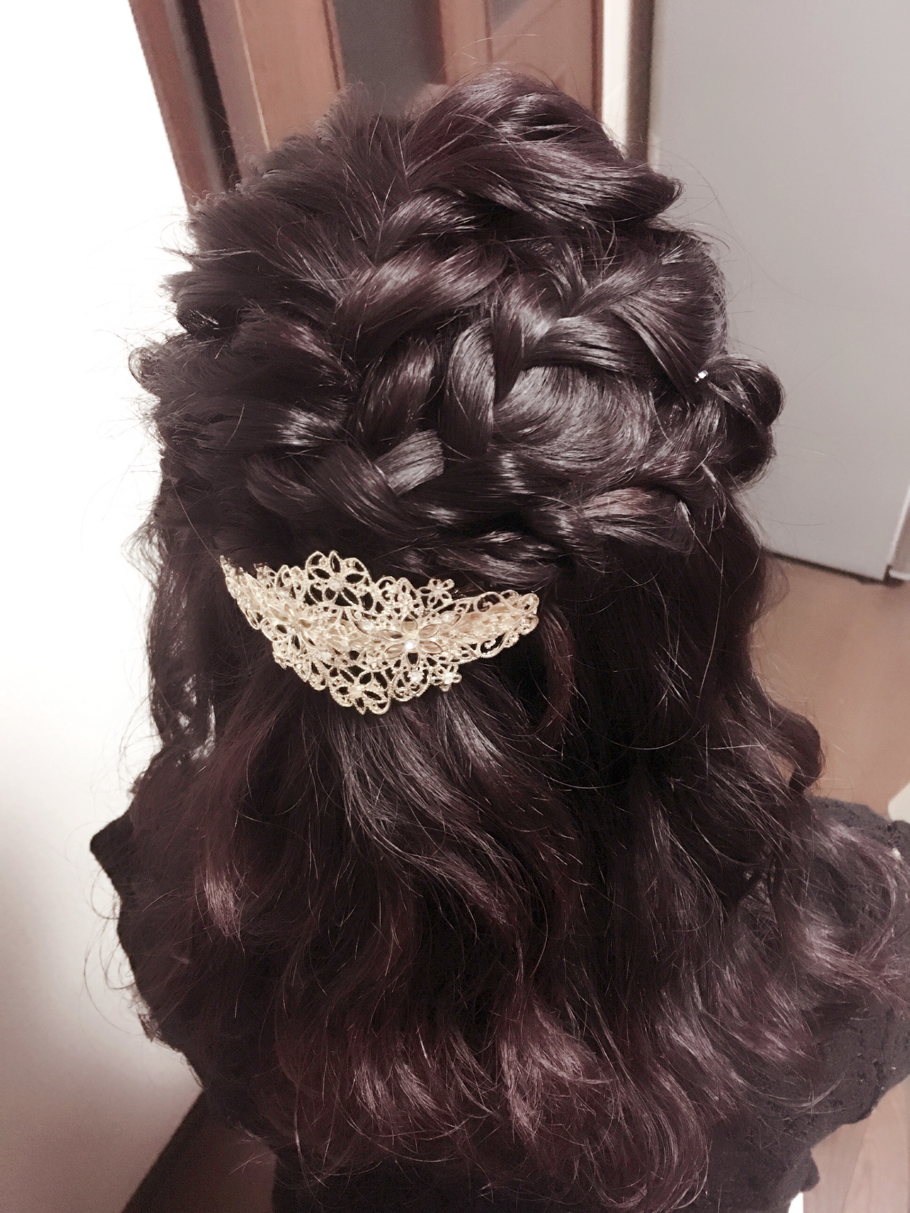 ハーフアップで波ウェーブをし、